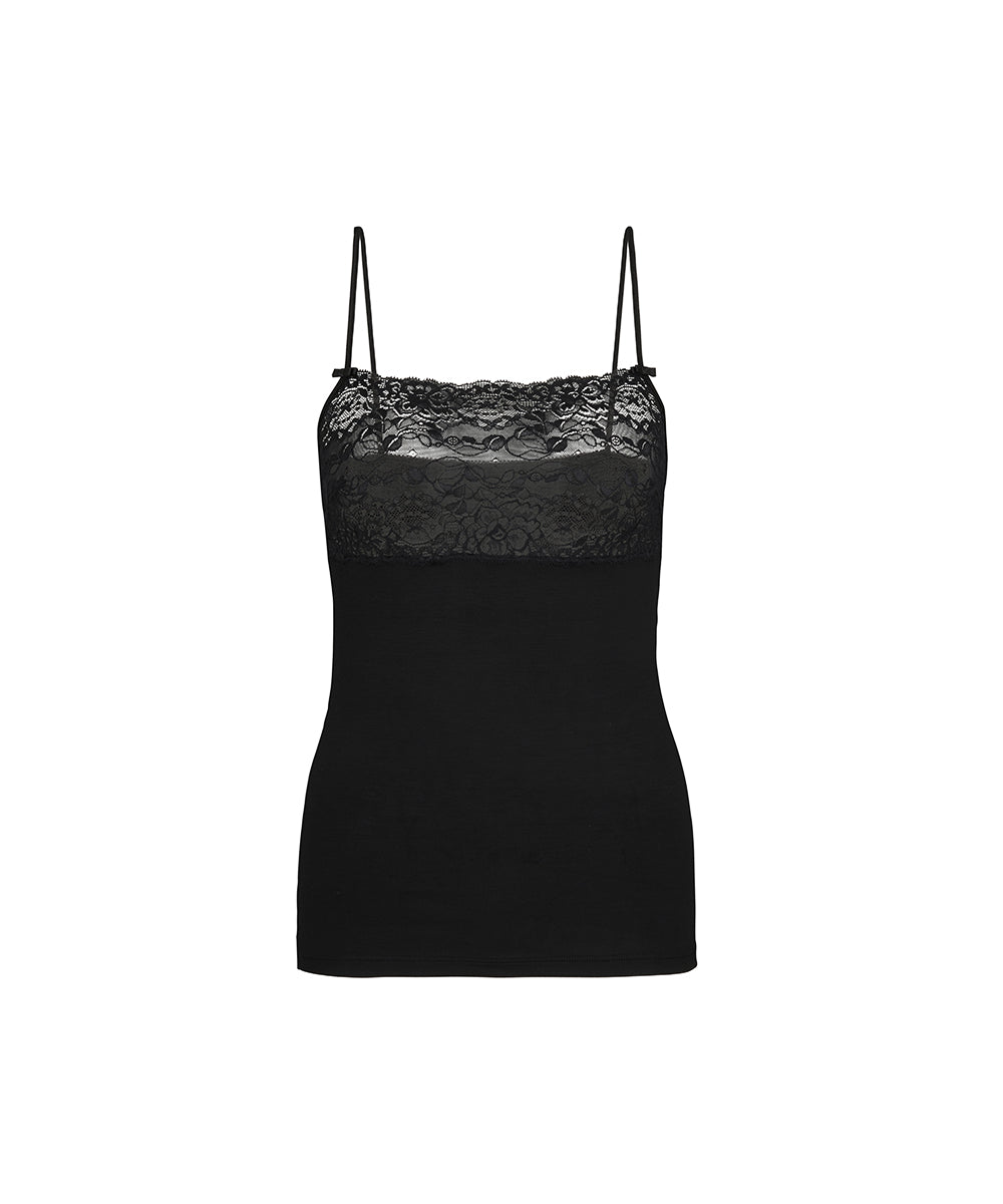 Basis top fra Calida med justerbare spaghettistropper. Dekoreret med en flot blonde øverst på frontstykket. Toppen er lavet i en kombination af bomuld, viskose og elastan. Vær obs på størrelsesguide.