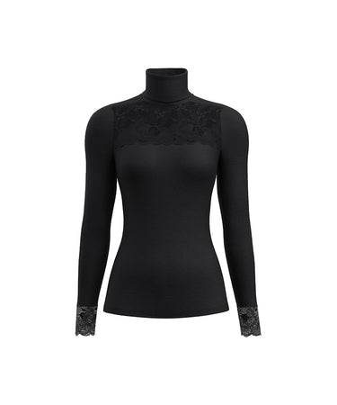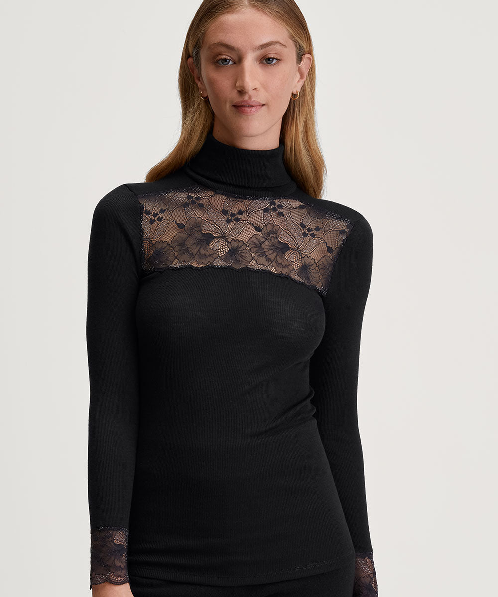 Yndig langærmet t-shirt med fine blonde detaljer fra Calida. Blusen har en smuk blonde i den høje halsudskæring. Blusen er lavet i uld og silke. Produkter der indeholder en kombination af uld og silke vil den få den egenskab, at det bliver temperatur-regulerende. Det betyder, at det kan varme på kolde dage og køle på varme dage. Vær obs på størrelsesguide.