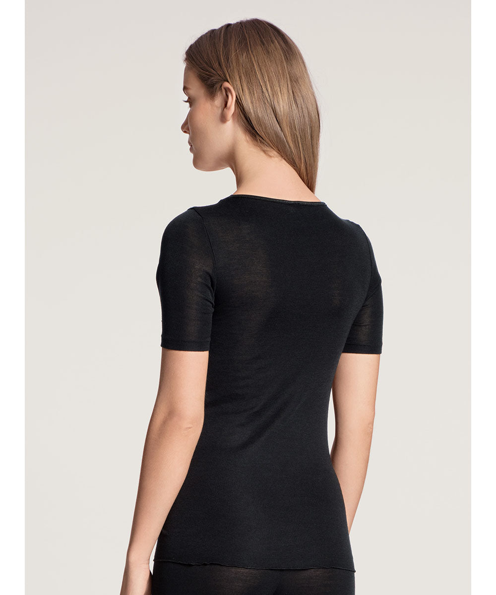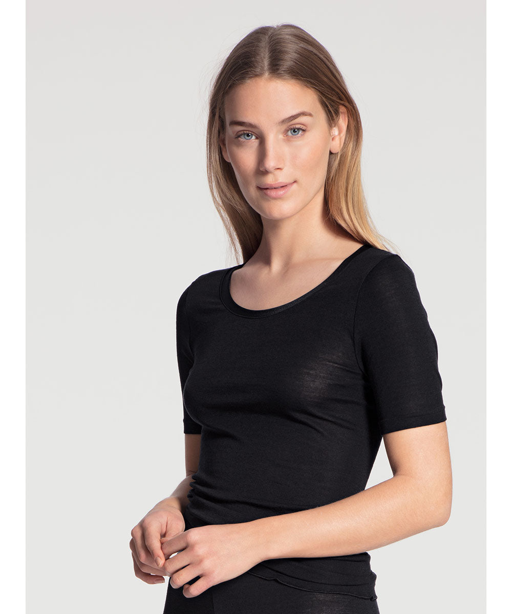 Basis top fra Calida med korte ærmer. Toppen er lavet i en kombination af uld og silke. Kvaliteten køler på varme dage og varmer på kolde dage. Vær obs på størrelsesguide.