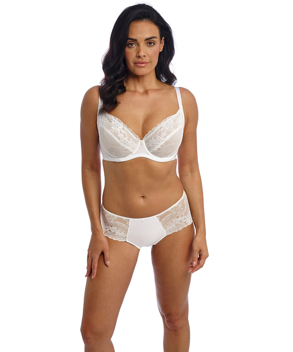 Hipster / shortstrusse designet i en all-over blomsterblonde fra Wacoal. Trussemodellerne hipster og shorts har en vandret benudskæring. Hipstertrussen går lidt op på balden og tegner et vandret snit mens shortsene dækker hele balden.
