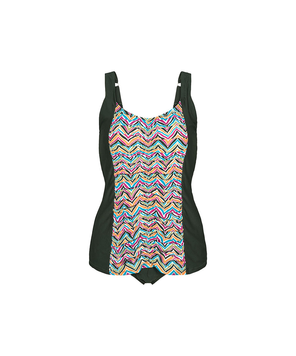 Komfortabel badedragt fra Wiki, som er designet med et draperet frontstykke. Badedragten har lommer, der kan holde dine proteser/indlæg sikkert på plads. Badedragten er uden bøjle. Badetøj skal gerne sidde stramt, da det udvider sig ved brug. Husk altid at skylle badetøjet op i koldt vand efter brug.