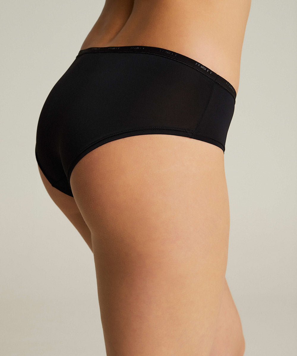 Hipstertrusse med en smal elastikkant fra Femilet. Fremstillet i blødt og tyndt materiale, der gør trussen behagelig at bære. Trussemodellerne hipster og shorts har en vandret benudskæring. Hipstertrussen går lidt op på balden og tegner et vandret snit.