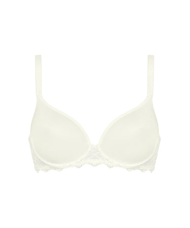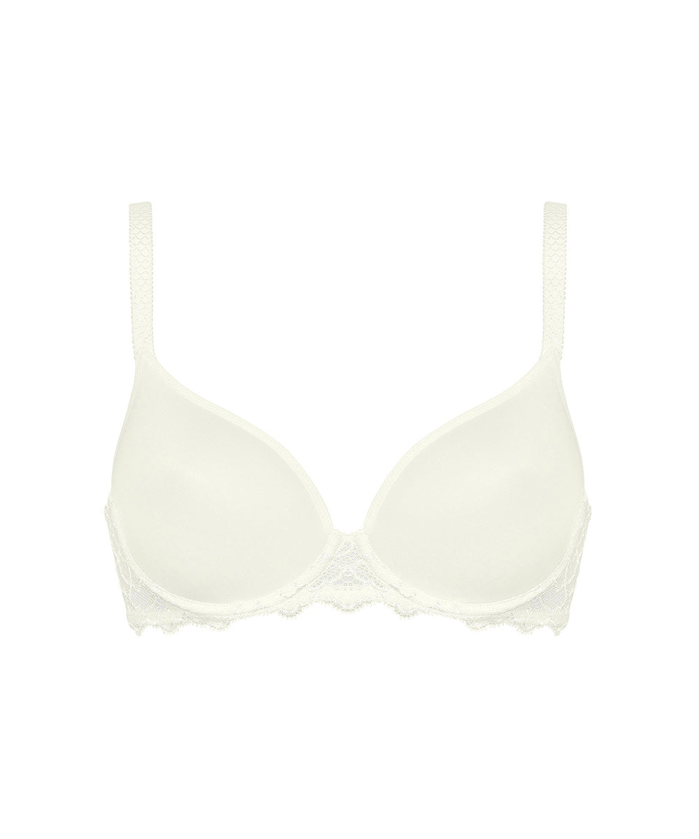 Simone Pérèles innovative 3D spacer er unik, da det forsvinder og bliver til "second skin" på kroppen. Materialet er utroligt blødt og samtidigt åndbart, hvilket gør det helt ideelt til lingeri. I Caresse trekvartskålsbh får du et smukt hjerteformet snit, der samler barmen i en elegant dekolletage. Bh'en er lavet i en ganske tynd vattering, der definerer barmen naturligt uden at tilføje ekstra volumen til barmen. Fantastiske og luksuriøse blondedetaljer på både skåle og omkreds, og ikke mindst en smuk, rundende pasform.