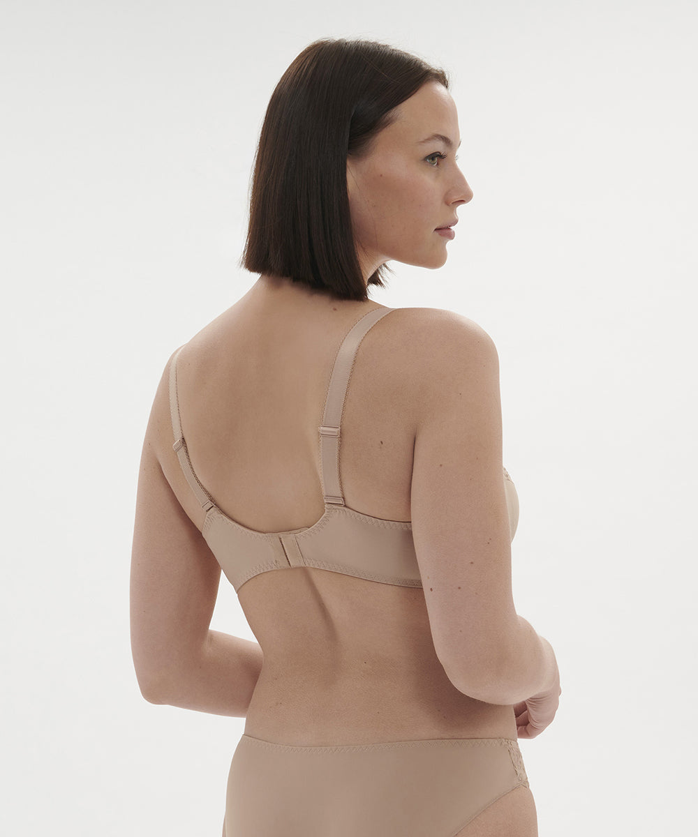 Elegant fuldskålsbh, der samler barmen i en flatterende dekolletage. Bh'en er konstrueret med en foring, der løfter og støtter barmen. Denne model dækker hele barmen samt giver en diskret kavalergang. Skålene er dekoreret med elegante blomster broderier. Med U-formet ballet back giver denne model optimal support. Ballet back karakteriseres ved stroppernes placering på bagstykket, som danner en U-form. U-formen omslutter kroppen tættere for bedre support og støtte samt fastholder stroppernes placering på skuldrene. Materiale: 56% polyester, 31% polyamid, 13% elastan.