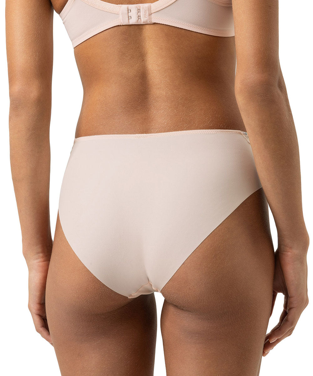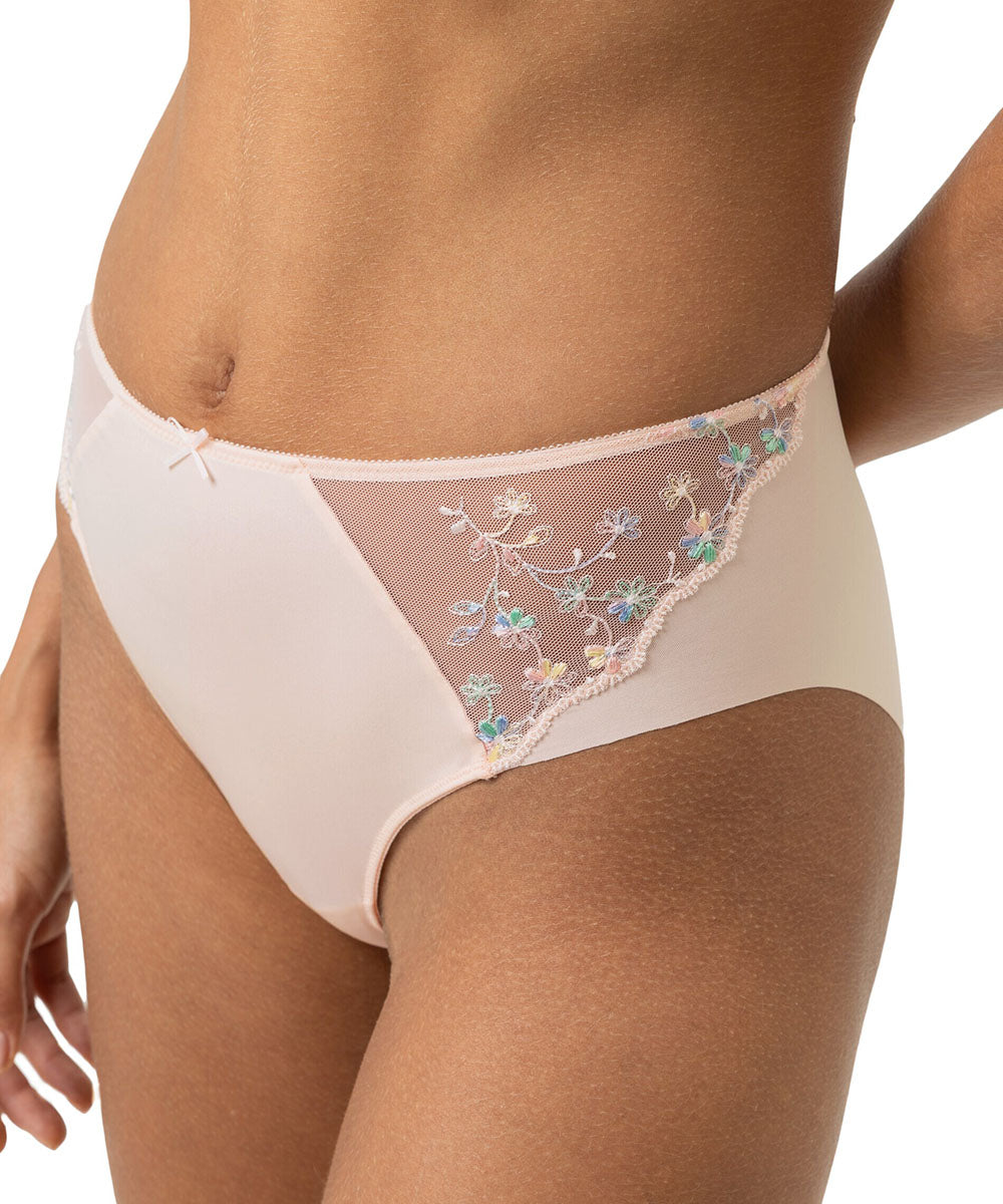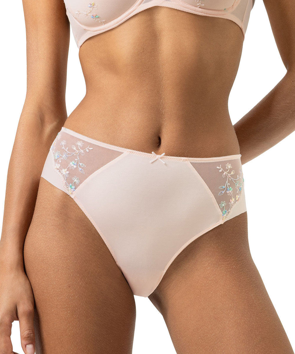 Elegant taitrusse fra Mey med fin blomsterblonde. Trussen er har god pasform og er lavet i et blødt materiale. Taitrussen er den bedstsolgte og mest almindelige trussetype. Taitrussen har som regel et skråt snit bagpå og dækker det meste af balderne. Et højt bensnit fortil og et smalt sidestykke får benene til at syne længere - altså er modellen god til dig, der gerne vil fremhæve ben og tilføre optisk længde.