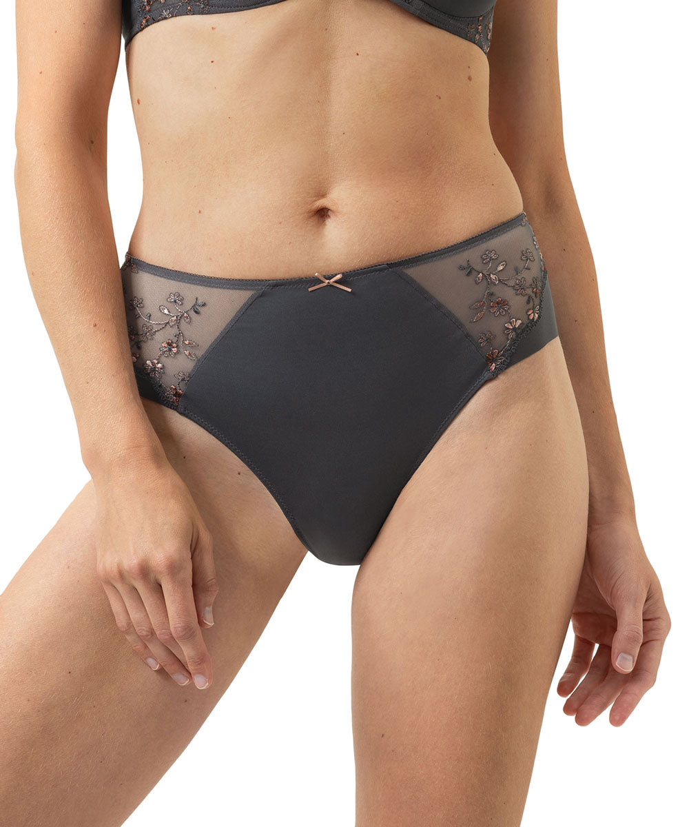 Elegant taitrusse med blondedetaljer fra Mey. Trussen er har god pasform og er lavet i et blødt materiale. Taitrussen er den bedstsolgte og mest almindelige trussetype. Taitrussen har som regel et skråt snit bagpå og dækker det meste af balderne. Et højt bensnit fortil og et smalt sidestykke får benene til at syne længere - altså er modellen god til dig, der gerne vil fremhæve ben og tilføre optisk længde.