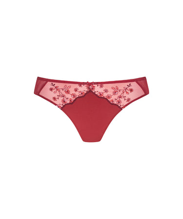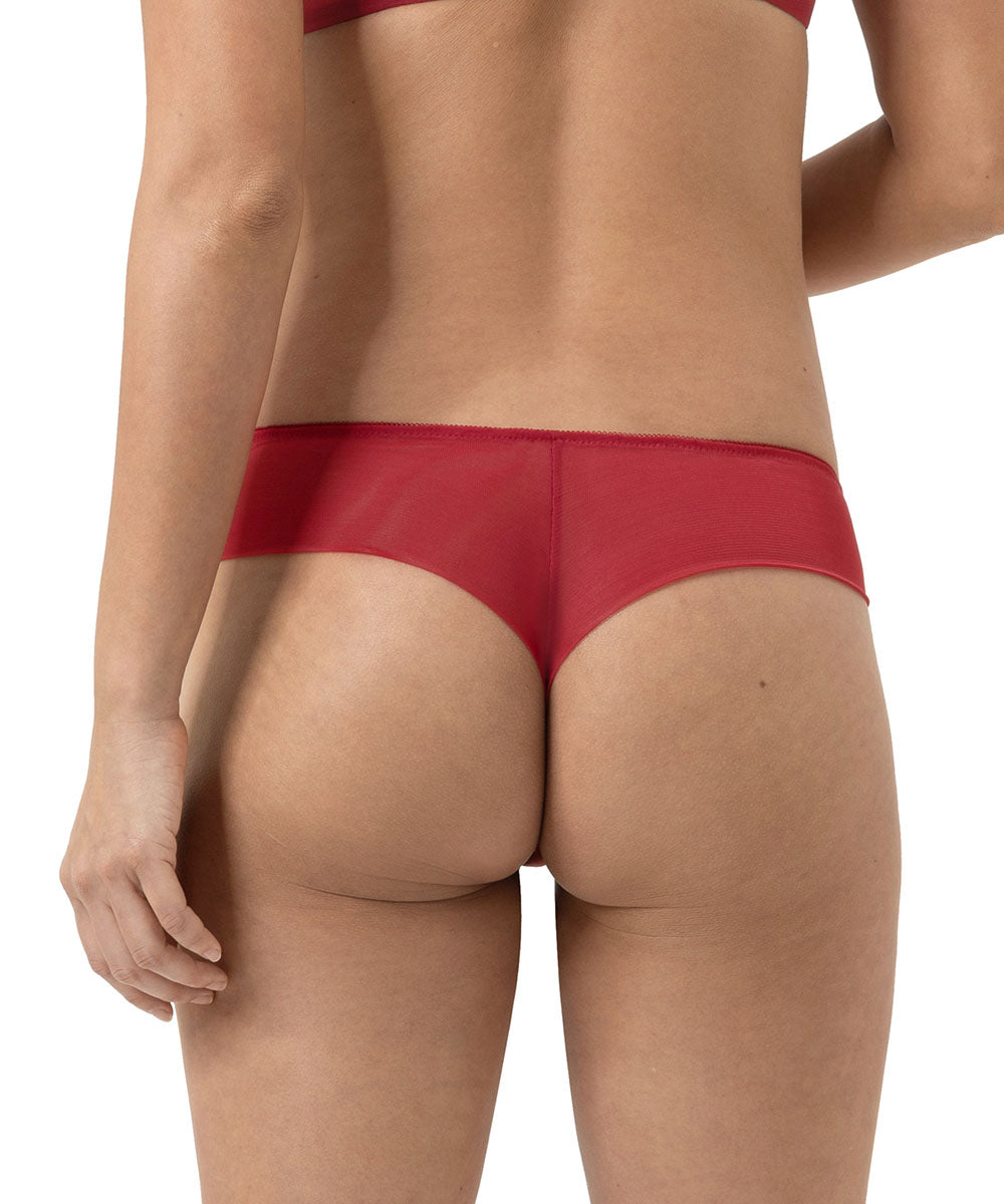 Stringtrusse fra Mey med fin blomsterblonde på sidestykkerne. Stringtrussen har tyl bag på, der får trussen til at forsvinde helt. String og tangatrusser er særligt velegnede under tætsiddende bukser, kjoler og nederdele, da bagstykket - en tynd streng mellem balderne - ikke efterlade synlige overgange under tøjet. Sting og tangatrusserne har en høj benudskæring og får derfor dine ben til at syne optisk længere.