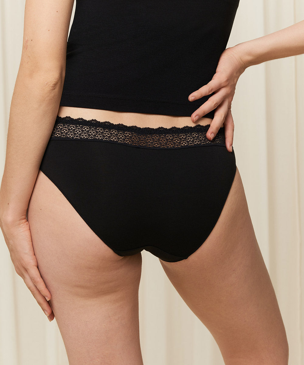 Behagelige og silkebløde taitrusse fra Triumph. Trussen er lavet i glat, bæredygtig Lenzing Modal stof, som er blødt og har beroligende egenskaber. Taitrussens taljebånd har blonder i kanten og er også genanvendt. Taitrussen er den bedstsolgte og mest almindelige trussetype. Taitrussen har som regel et skråt snit bagpå og dækker det meste af balderne. Et højt bensnit fortil og et smalt sidestykke får benene til at syne længere - altså er modellen god til dig, der gerne vil fremhæve ben og tilføre optisk længde.