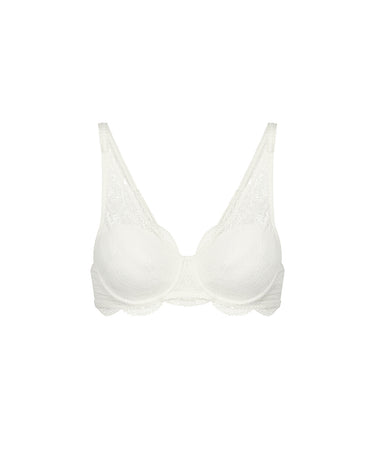 Trekvartskålsbh fra Simone Pérèle dekoreret med yndig, flad blonde, som er afsluttet med en fin picotkant. Bh'en er designet med bøjle, der giver et flot løft og optimal support. Stropperne er multifunktionelle, og kan justeres til klassiske stropper eller crossover. Simone Pérèles innovative 3D spacer er unik, da det forsvinder og bliver til "second skin" på kroppen. Materialet er utroligt blødt og samtidigt åndbart, hvilket gør det helt ideelt til lingeri. Trekvartskålsbh'en giver god støtte til barmen. Den dækker og holder på plads, men din barm er ikke pakket helt ind. Trekvart-modellen skråt skåret skåle, som ligger sig flot ind til barmen.
