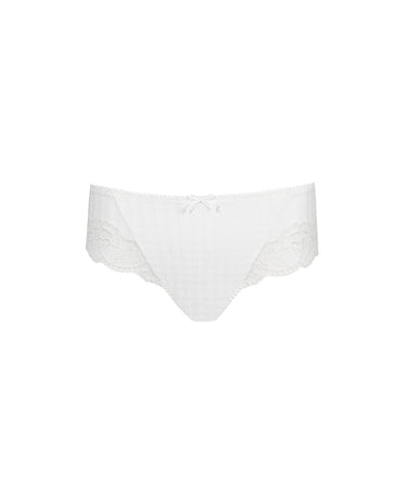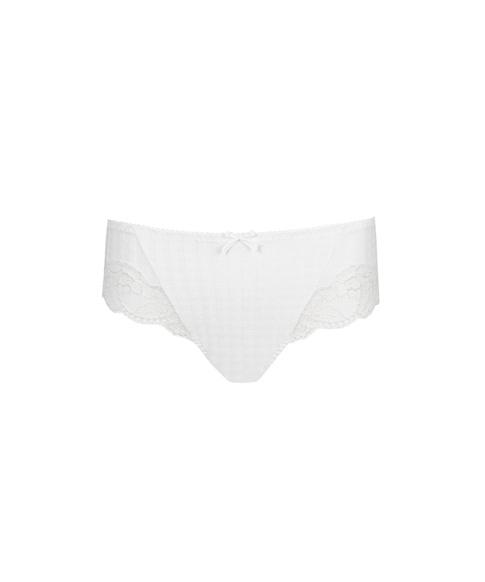 Elegant hipstertrusse fra PrimaDonna designet i et opakt, ternet mønster og dekoreret med en fin blonde. Trussemodellerne hipster og shorts har en vandret benudskæring. Hipstertrussen, fra PrimaDonna, går lidt op på balden og tegner et vandret snit mens shortsene dækker hele balden.
