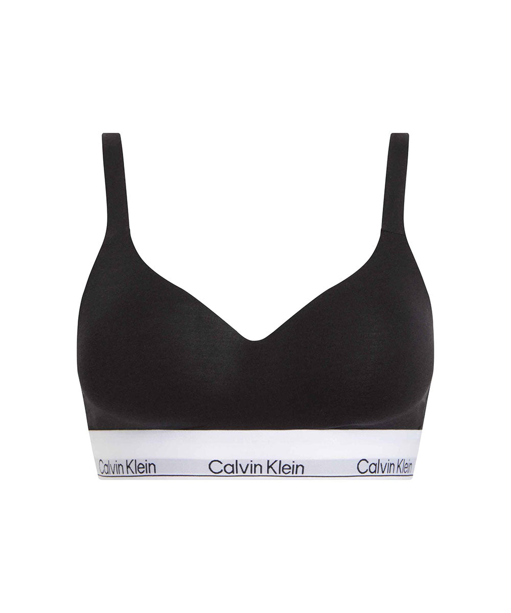 Calvin Klein bh-top eller bralette i bløde materialer og med let vatterede skåle. Toppen er designet med elastisk logokant under brystet og på stropperne. Stropperne kan både benyttes som almindeligt eller til at krydse på ryggen. Trekantsbh'er er er skåret skråt og tegner dermed et v-snit for til på barmen. Fordi trekantsbh'en løber skråt over barmen, kan modellen være god til kvinder med mindre fylde øverst på barmen - den skrå linje lukker skålen for oven, så den ikke så let gaber. Mange trekantsbh'er er uden bøjle og derfor særlig anvendelige til dig, der helst er fri for traditionelle bøjler. Materiale: bomuld (genanvendt) 53%, modal 35%, elastan 12%