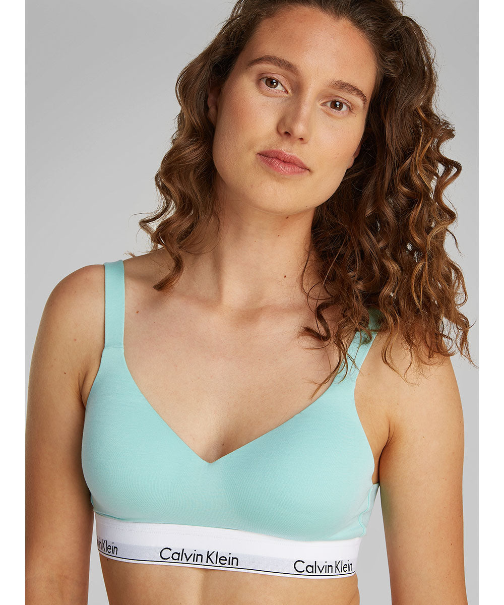 Calvin Klein bh-top eller bralette i bløde materialer og med let vatterede skåle. Toppen er designet med elastisk logokant under brystet og på stropperne. Stropperne kan både benyttes som almindeligt eller til at krydse på ryggen. Trekantsbh'er er er skåret skråt og tegner dermed et v-snit for til på barmen. Fordi trekantsbh'en løber skråt over barmen, kan modellen være god til kvinder med mindre fylde øverst på barmen - den skrå linje lukker skålen for oven, så den ikke så let gaber. Mange trekantsbh'er er uden bøjle og derfor særlig anvendelige til dig, der helst er fri for traditionelle bøjler. Materiale: bomuld (genanvendt) 53%, modal 35%, elastan 12%