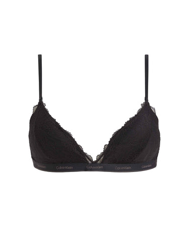 Calvin Klein bh-top eller bralette med en fin allover blonde. Toppen er designet med elastisk logokant under brystet og justerbare stropper. Trekantsbh'er er er skåret skråt og tegner dermed et v-snit for til på barmen. Fordi trekantsbh'en løber skråt over barmen, kan modellen være god til kvinder med mindre fylde øverst på barmen - den skrå linje lukker skålen for oven, så den ikke så let gaber. Mange trekantsbh'er er uden bøjle og derfor særlig anvendelige til dig, der helst er fri for traditionelle bøjler. Materiale: genvendt nylon / polyamid 61%, elastan 39%