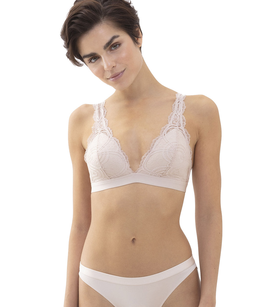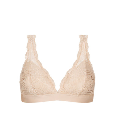 Trekantsbh i en all-over blonde fra Mey. Trekantsbh'en er uden bøjle og vattering. Bh'en har et elastisk bånd i omkredsen og stropperne er justerbare. Trekantsbh'er er er skåret skråt og tegner dermed et v-snit for til på barmen. Fordi trekantsbh'en løber skråt over barmen, kan modellen være god til kvinder med mindre fylde øverst på barmen - den skrå linje lukker skålen for oven, så den ikke så let gaber.