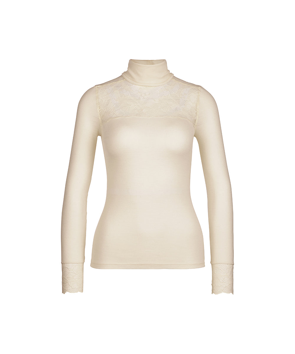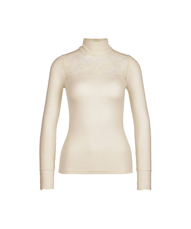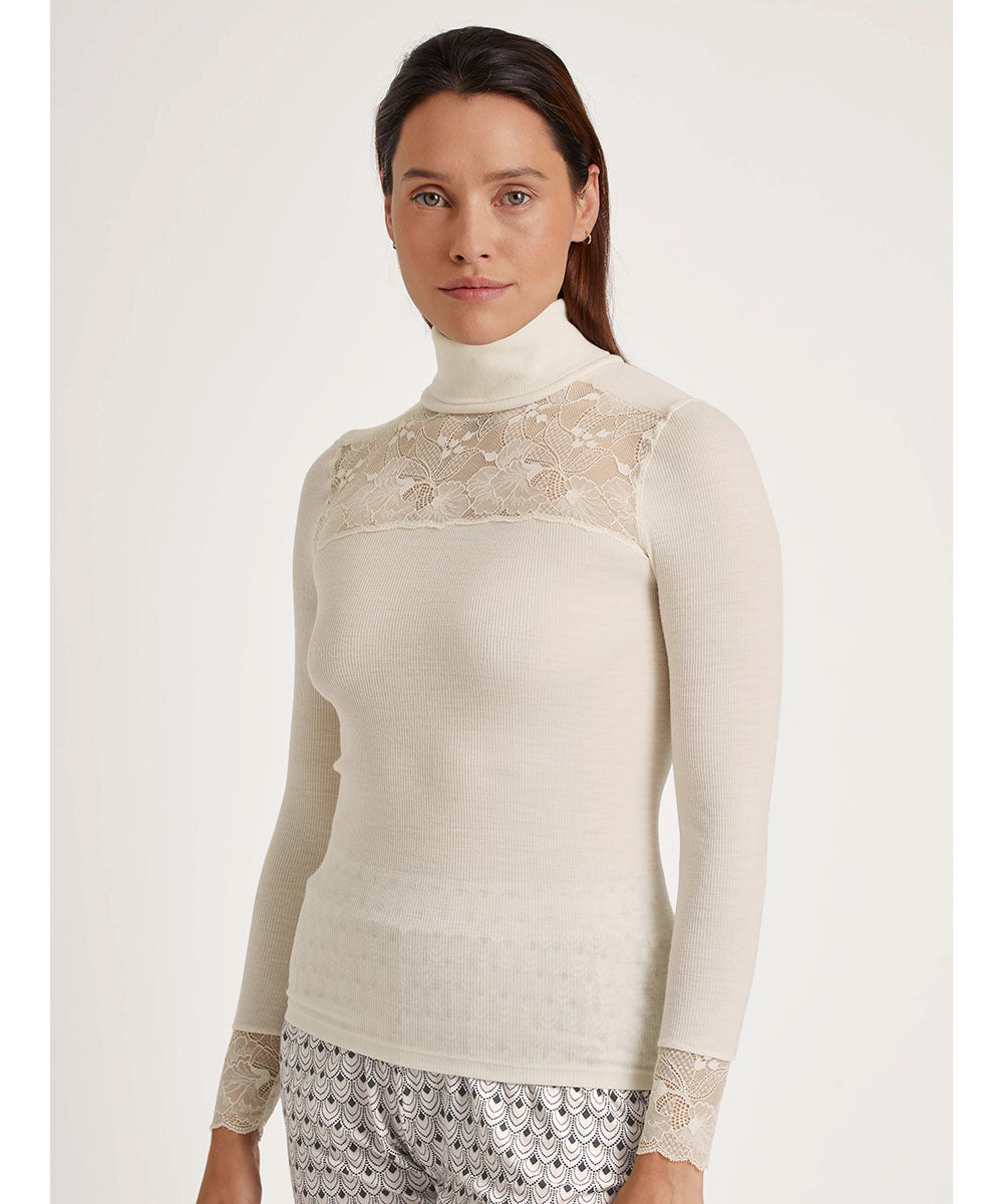 Yndig langærmet t-shirt med fine blonde detaljer fra Calida. Blusen har en smuk blonde i den høje halsudskæring. Blusen er lavet i uld og silke. Produkter der indeholder en kombination af uld og silke vil den få den egenskab, at det bliver temperatur-regulerende. Det betyder, at det kan varme på kolde dage og køle på varme dage. Vær obs på størrelsesguide.