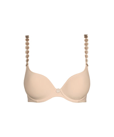 Let vatteret trekvartskålsbh fra Marie Jo med hjerteformede skåle. Stropperne kan enten bæres klassisk eller justeres til en halterneck. Denne model løfter og deler barmen, der giver en flatterende rund silhuet og diskret dekolletage. T-shirt bh'en er designet med glatte skåle, der ikke ses under stramtsiddende tøj.