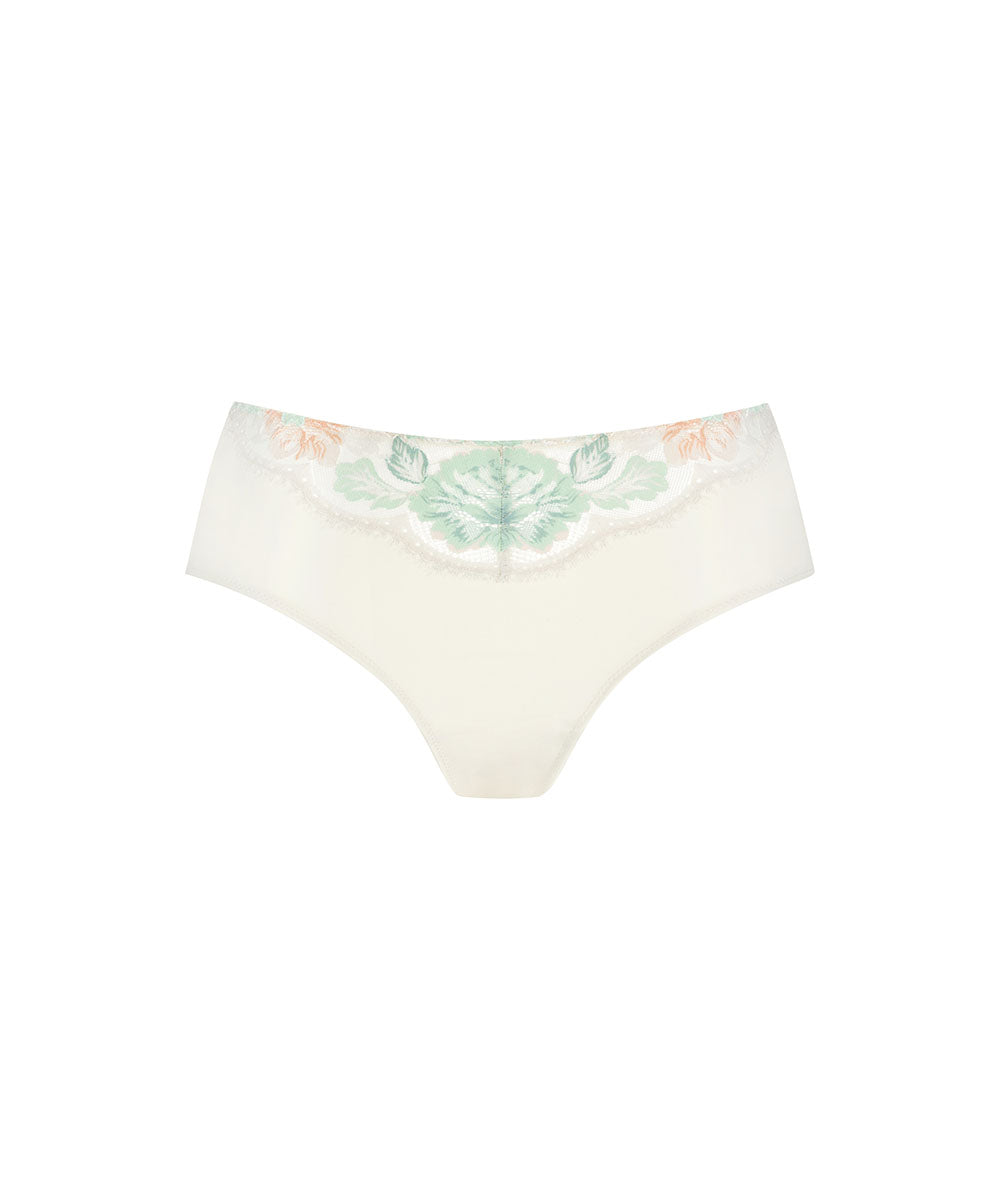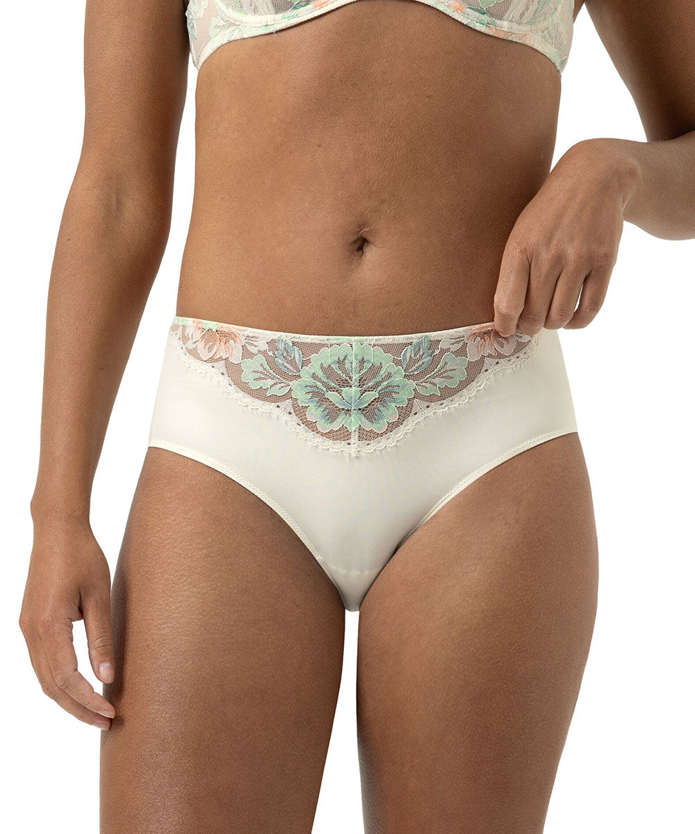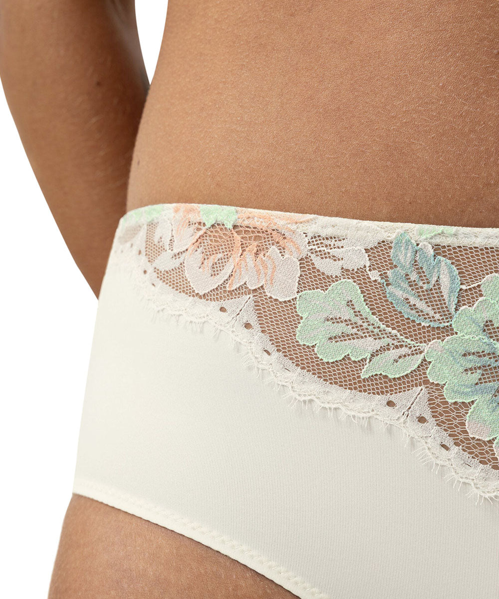 Elegant taitrusse med fin blomsterblonde. Trussen er har god pasform og er lavet i et blødt materiale. Taitrussen er den bedstsolgte og mest almindelige trussetype. Taitrussen har som regel et skråt snit bagpå og dækker det meste af balderne. Et højt bensnit fortil og et smalt sidestykke får benene til at syne længere - altså er modellen god til dig, der gerne vil fremhæve ben og tilføre optisk længde.