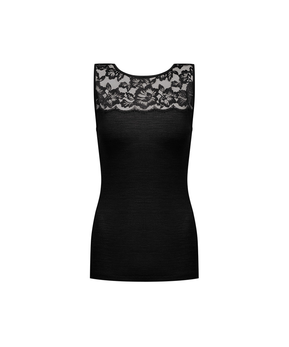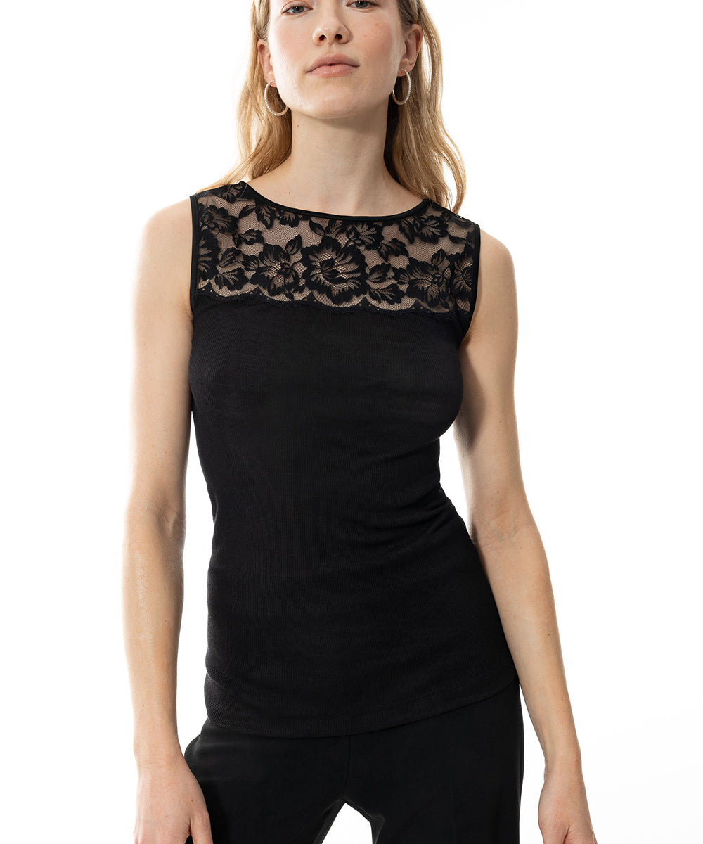 Bluse uden ærmer i uld fra Mey. Toppen er prydet med yndige blonder i halsudskæringen som fortsætter op ad stropperne. Toppen er lavet i uld og silke. Produkter der indeholder en kombination af uld og silke vil den få den egenskab, at det bliver temperatur-regulerende. Det betyder, at det kan varme på kolde dage og køle på varme dage.